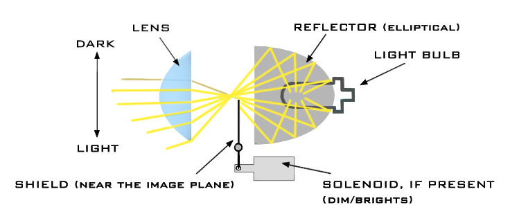 The cutoff you see in the image I posted is created by a metal shutter placed inside the projector's optical path. In OEM applications, that shutter defines the beam pattern, and moves up and down to switch from lo-beam to hi-beam.