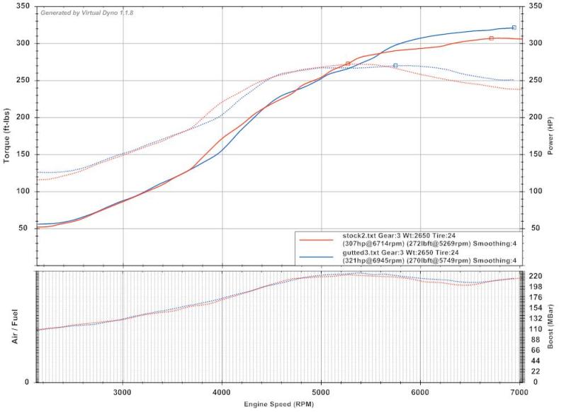 I took 3 datalogs of each, all 3rd gear pulls, all in similar conditions on the same day and loaded them in virtual dyno. These were the most representative runs of the 3 pulls with each setup. Stock manifold with VICS working (red) vs Gutted Manifold (blue)