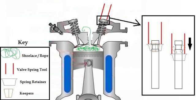 What you want to do is pry downwards on the tool, pushing the retainer down the valve stem and freeing the keepers. The keepers will probably stick to the valve stem, so you want to have a pick handy to flick them off. Once they are free, slowly release the tool until the spring is fully uncompressed. I’ve included a rudimentary drawing as well. (Base picture from TheAutoPartsShopDOTcom modified with my mind blowing MS Paint skill)