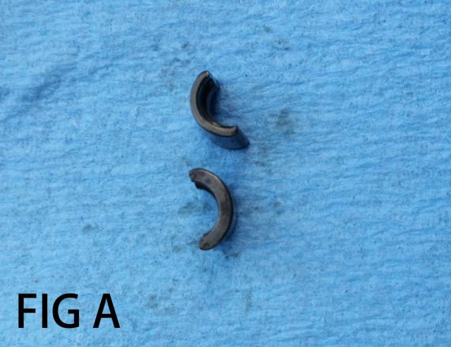 Drop your spring back in, followed by the retainer with the keepers. FIG A shows one keeper facing each way. Notice how one side is fatter? The fat parts go up. You can now drop the retainer on top of the spring with the keepers in it.
