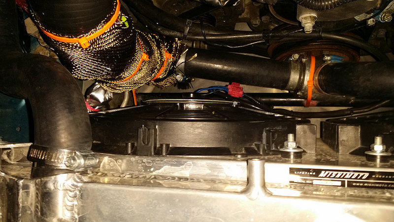 Post intercooler, about 2" behind radiator and fan, it blows fkin hot! I'm just trying to keep the heat OFF the aluminum. I GOTTA believe that air coming out of the radiator is heat soaking the aluminum connector pipe?