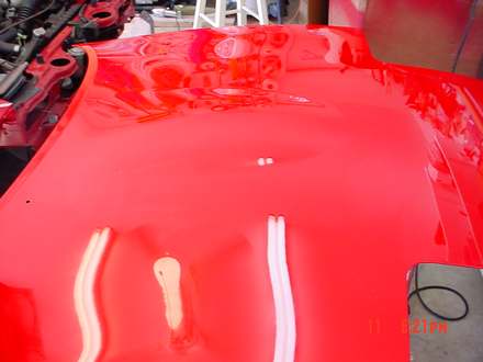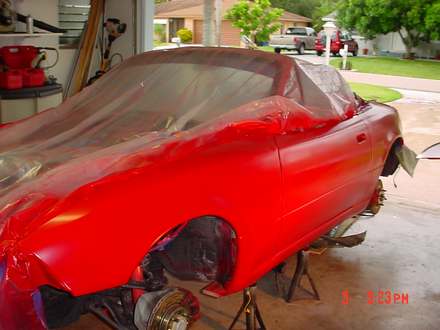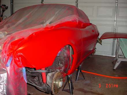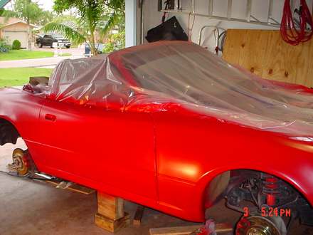 This rain is slowing me down. I shot the Base Coat on the hood, rear bumper, front bumper and headlight covers at least. Going to have to shoot the Clear Coat another time. This is soooo time consuming. I wish I wasn't so ---- and I didn't have Ship Wrights disease..... Taking me forever to complete.