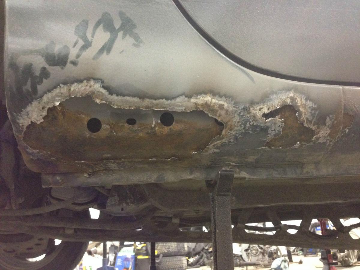Try to minimize the janky fiberglass/bondo filling. It will make you sadder than you were happy about the money saved when the car starts to revert back to a rust bucket, bulging with fiberglass at the rockers, in a few years or less. I wouldn't consider making this about lightness if it sacrifices the integrity of the jack point at all. I found you don't really know how bad the rust is under there until you get in and look.