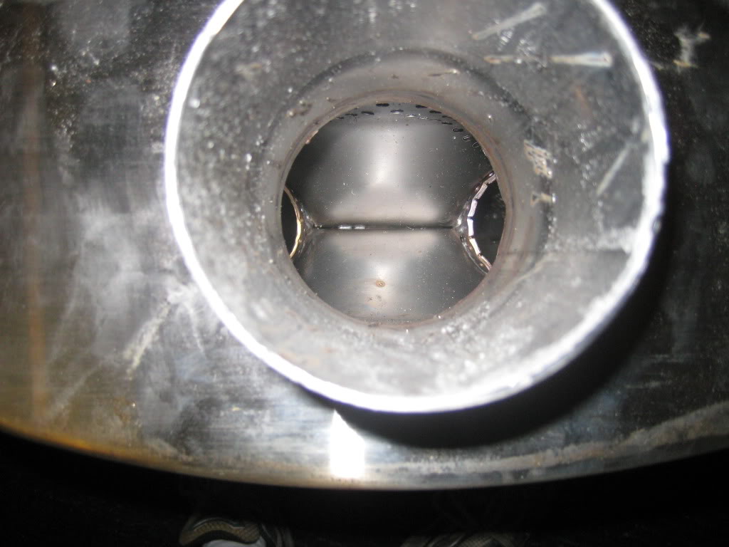 I don't have any pictures, so I drew this one. It is single chamber 3" perforated stainless the whole way thru, with two pie cuts like pictured.