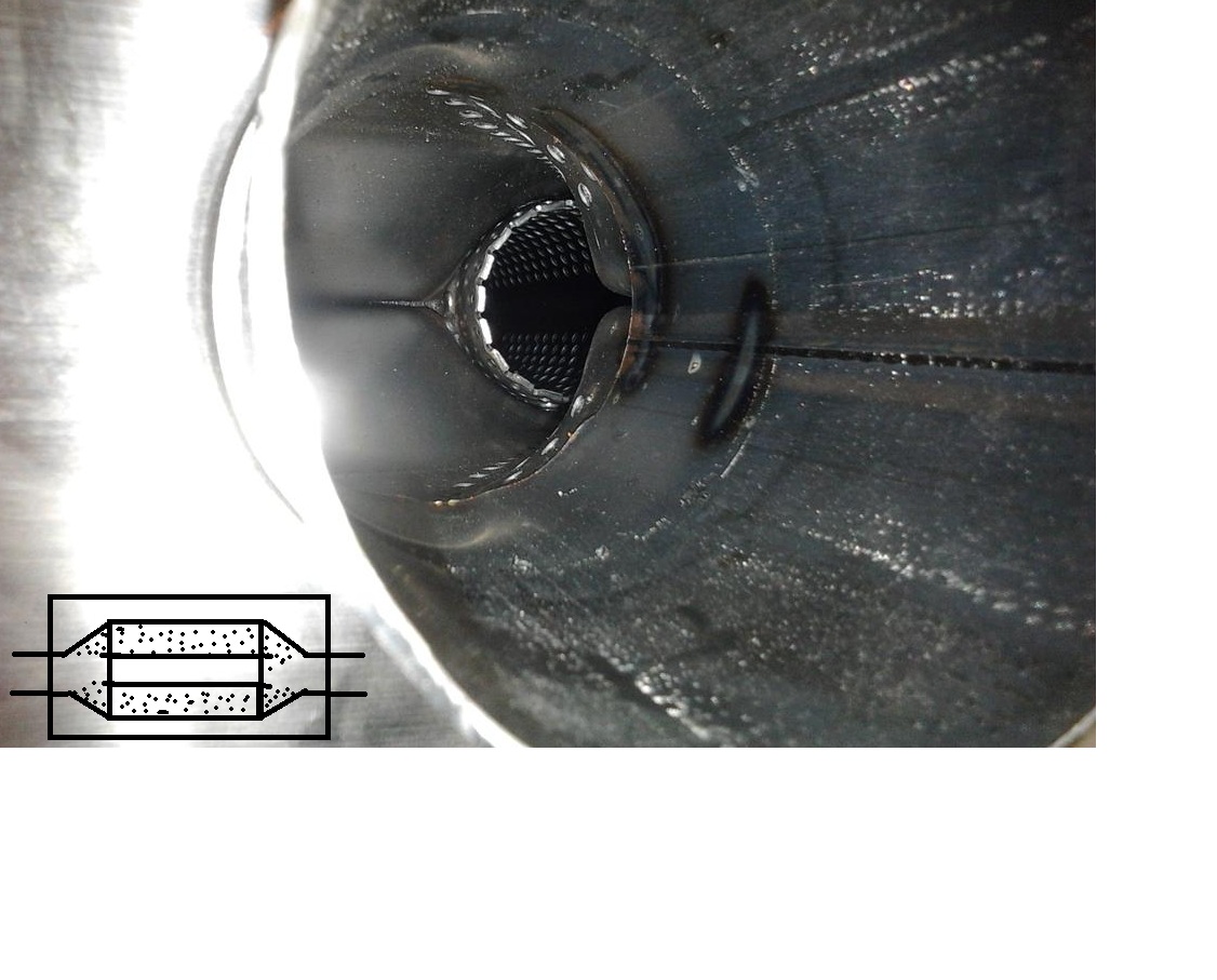 This image is interesting. You can see where the inside edge of the perforated internal tube "disrupts" the flow into the side tubes. On my 1x579 muffler there was one end that looked like the above pic, and the other end was actually much better. It may just be manufacturing tolerance (or lack thereof) or simply luck of the draw. My muffler is oriented so that the "better" side is the "inlet" side. I'd like to think that'll help.