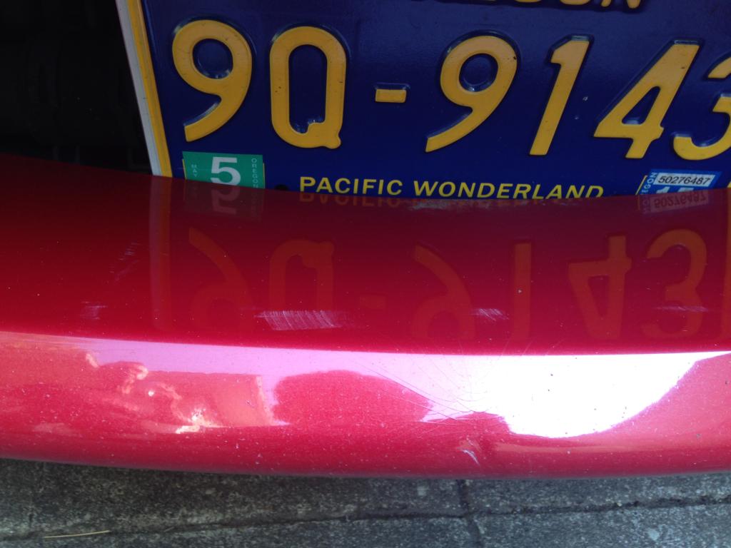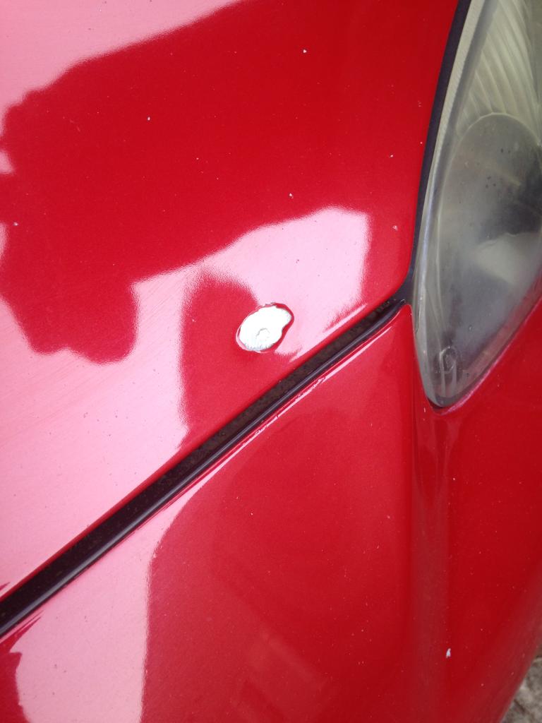 Big chip/dent in the hood, apparently right after the PO bought it and was driving it down from Seattle. Head lights also need a polish.