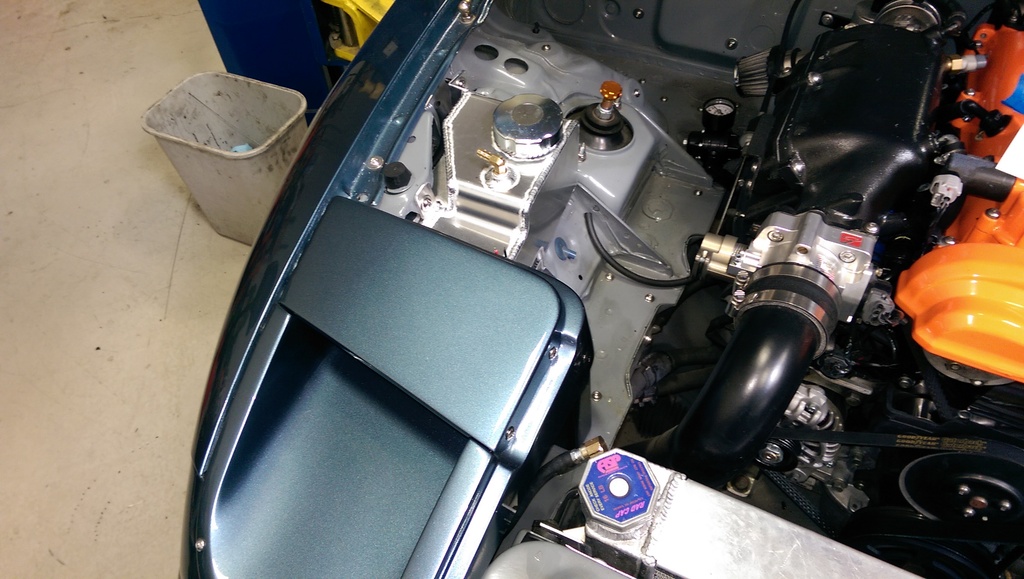 Changed the catch can for the one from Canton Racing. The one I was using was going to go in front of the radiator but there is now a big honking FMIC there. It did not really fit in the engine bay.