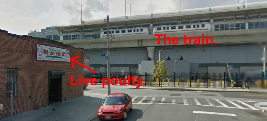 As you exit the airtrain into the Jamaica Station / Sutphin Boulevard platform, you are in the middle of Queens, NY. And you look down through the glass windows, and you see below you F&D Live Poultry Inc.