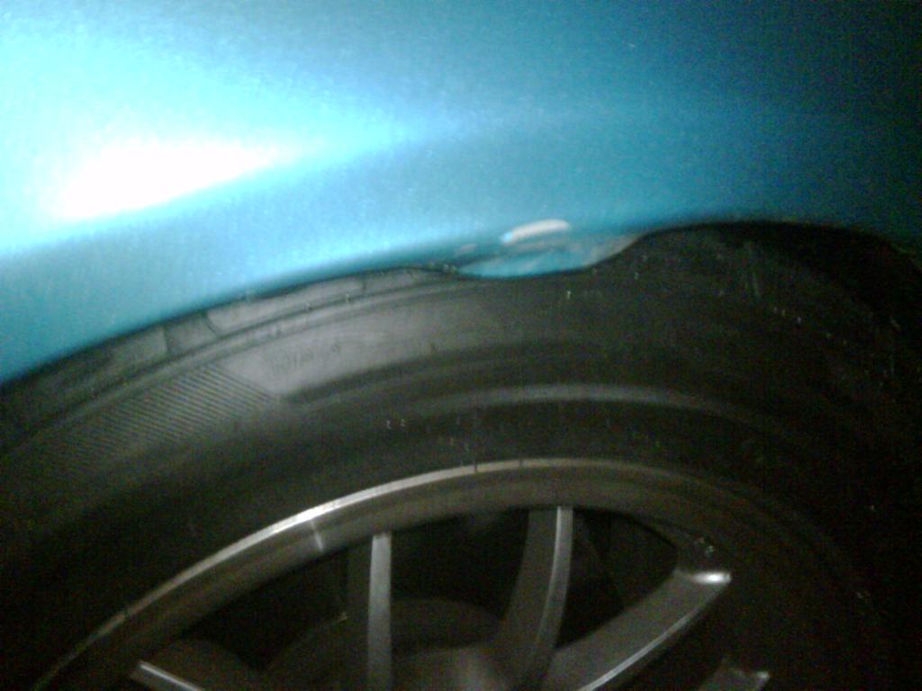 This accident wasn't nearly as bad.. I think. My tire seems to be aok, wheel isn't bent (yay 6UL power), but my fender is fucked up a bit. I'm not sure how it happened. I run 225/50/15 RS2s on the 15x8 6ULs suspended on KYB AGX w/ FM springs front and rear and they do rub the wheel well plastic and mebbe the fender a tiny bit at full lock and under shock compression. I don't know how the pic below happened tho.. I'm thinking maybe the shock bottomed out and it squashed the bumpstop? I'm bewilderfucked.