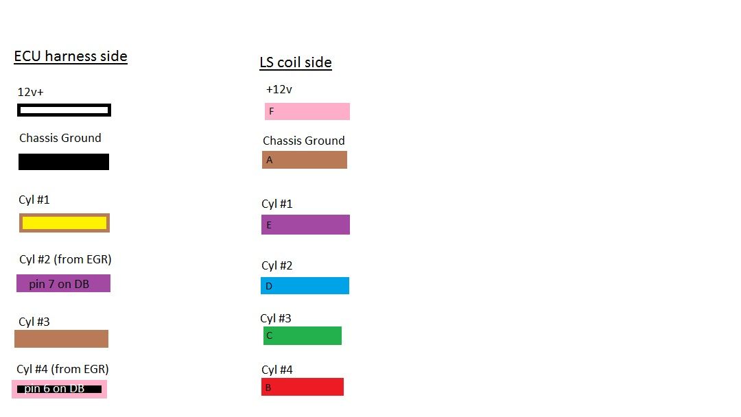 Color coded. Colors are for my '99 and LS2 coils. Just ignore the EGR part if you want. I deleted the EGR and was originally reusing the wires for ignition. Either run 2 new wires or reuse wires from stuff you are not using.
