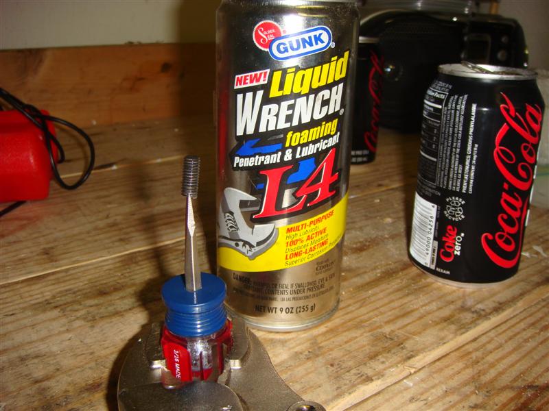 ViceGrips, stubby flat-blade, and Gods' own Miracle Juice. I think I love Liquid Wrench so much I'm going to put it on a salad with some fava beans and a nice chianti.