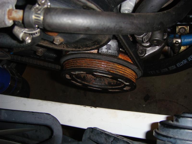 OK, pulley off no problem. I discovered what may have caused this. If you torque things properly, this shouldn't happen... but I need best advice on how to get this thing out. There's precious little room down there as I've got an RB sway and the swaybar reinforcer piece.