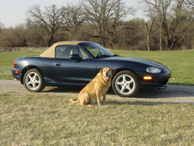 Got it home today. It was a nine hour round trip, but worth it. The car was as clean as advertised. Leather, PEP, Torsen, 51K miles. Came with the original tan boot cover (new) a couple of bras, (can't say that I will use them) and a nice car cover. I will keep it inside, but the cover will be nice for winter storage. Ran great on the way home and it was our first day in the 70's so got some top down driving! The PO must have been color blind, as he said it was greenish? WTH color is this? Kind of a dark blue/grey? Got my boy in the pic. Zach would much rather be chasing pheasants than posing for pictures.