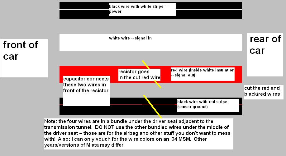 Cut open the plastic wrap. The four wires (on an '04 at least) are: 1., black with white stripe (power), 2., white (signal in), 3., red (mostly wrapped in a second layer of white insulation - signal out), 4., black with red stripe (sensor ground).