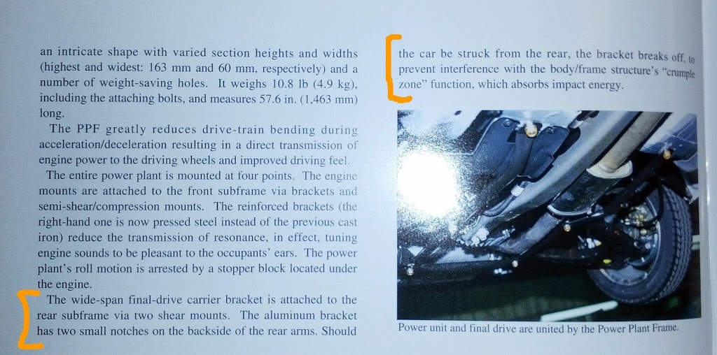 As several guys have stated and the book confirms, the differential carrier is engineered to break in a front/rear impact. It protects the rest of the drivetrain when the chassis crumples. I have an extra copy of this book I can send it to you if it would help. You don't have enough posts for PM but you can email me at brian at mx5<dot>net. When this is all resolved, I strongly recommend getting a new insurance carrier. 15% isn't worth this crap. Sorry...