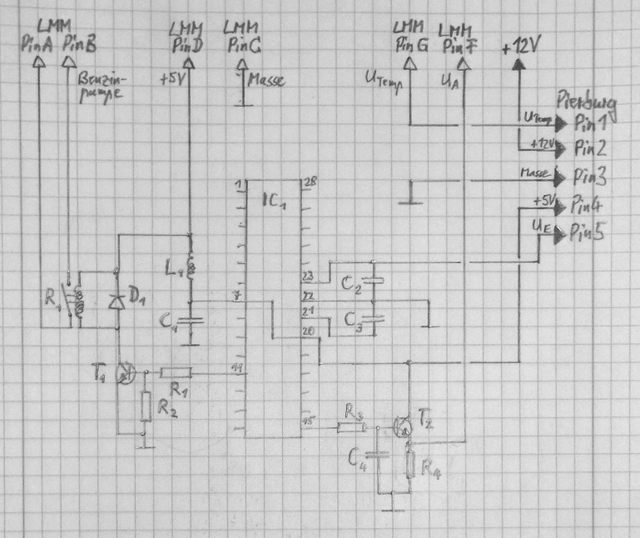 Yeah, it's pretty straightforward. U1 is a microprocessor which is taking in the analog signal from the MAF on pin 23, and using either a lookup table or some formula to output an inverted analog signal on pin 15 via T2. (It's also driving a relay to trigger the fuel pump, presumably when MAF > nothing.)