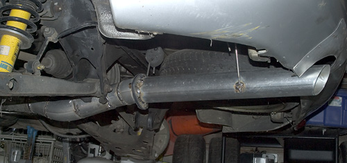 I went straight out the back with a 3" exhaust. There's enough room for a 13"L muff between the subframe and chassis rear. Flanged just past the diff for tail pipe swapping. Have straight pipe on in photo- turbo style muff on it now. Figured I'd try it since the bumper was damaged (scraped) from being rear ended. The heat plate was a mock-up, but will get some 18ga. stainless cut.