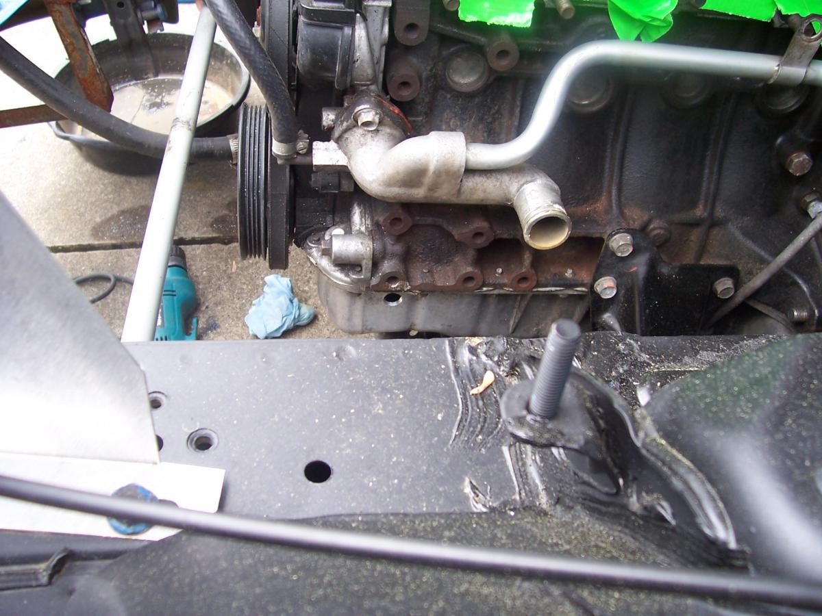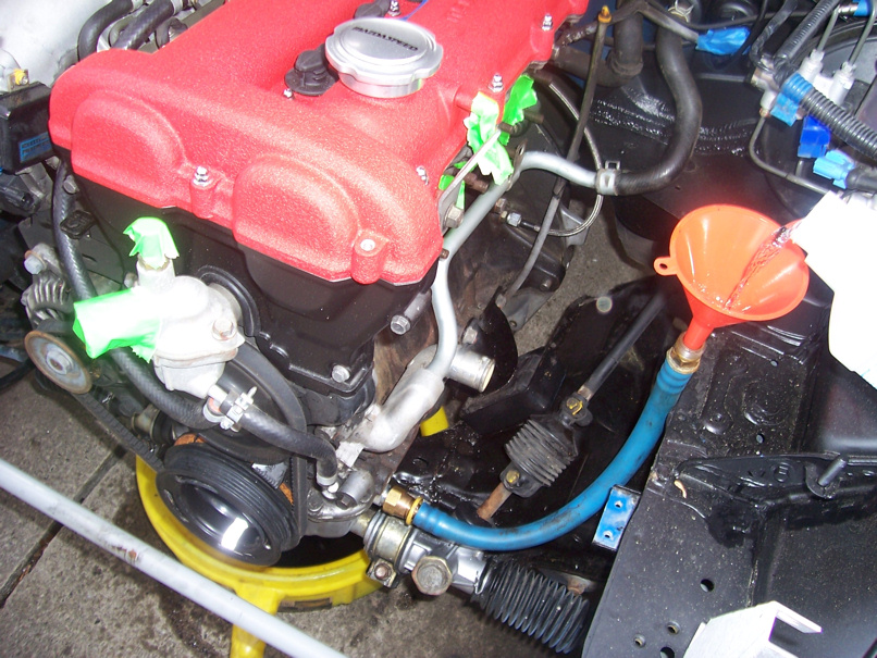 The oil drain on my Greddy setup went to a stock location on the block. Next to the oil filter, right behind the alternator. Once again, alot easier to work in this area with the intake manifold bracket removed. Black nipple and a clamp come off, oil drain line slips on. Only problem is it's on the other side of the engine. So now your oil drain line is 7ft long and makes 4 circles before it gets there. **** THAT!