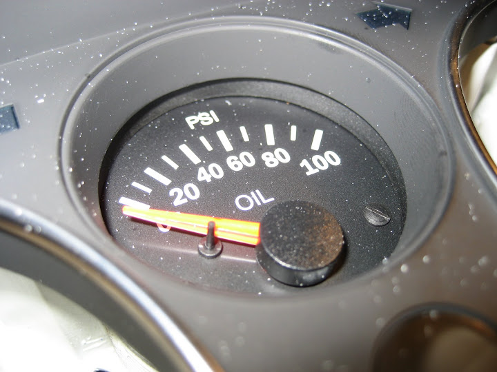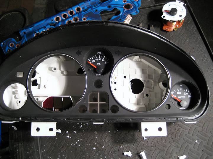 Begin by totally disassembling your cluster, I had the good fortune to have a spare one on the shelf (Hi Braineak!). I used VDO Vision gauges, and removed the outer bezel and glass from them. Starting with the oil pressure gauge, I used the Dremel to get rid of anything in the way, and made holes in the back of the cluster to fit the gauge connectors & bulbs. Notice that I kept one of the light bulbs in the cluster, because it was very close to the OP gauge body.