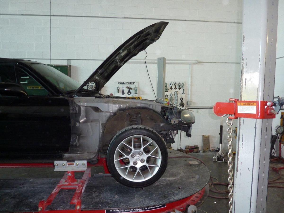 Car was totalled by insurance but since I had just installed a MSM 6SPD and pulled the auto, had the turbo all nice and tuned... and a bunch more work... I wanted to keep the car. So here we are a year later and... car is sans turbo (hence the new yellow toy) but I felt that I owed it to myself to make this car good again.
