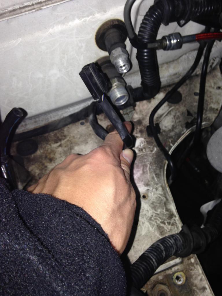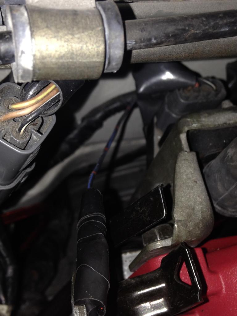 5) Alright, this one is a real problem because the connector itself got broken off, although it was your standard black female connector similar to the one that connects to the starter and oil pressure sender. However, it comes from the harness near the back of the block by the coilpack on the passenger's side firewall. It was originally covered in plastic sheathing. I extended it thinking it was the starter wire, but it wasn't so please ignore the electrical tape and anything past it. The wire is blue and red. Anyone know what this is/where it goes?
