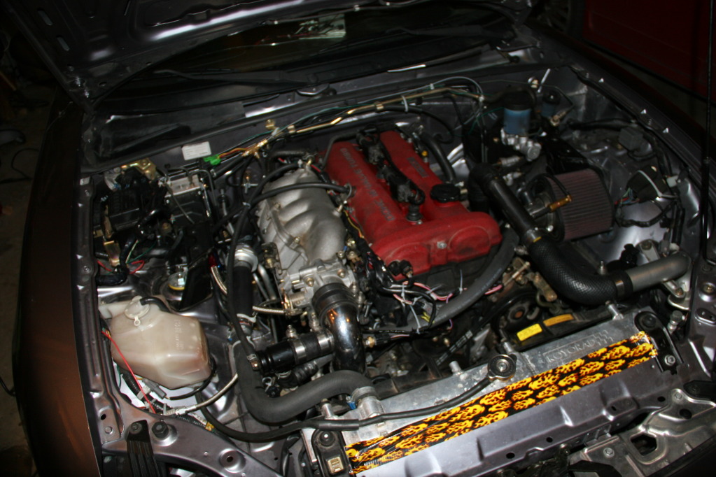 Engine pics as requested. 2 hoses that are off of the Valve cover are not hooked up to anything in that picture. I have them pointed to the ground right now. I am getting a decent amount of water vapor from hot side. I think it was the air condensing in my catch bottles. The valve is still in place on the cold side. No flow through it at all. The excessive number of zip ties, is my trying to make sure nothing is rubbing anywhere.