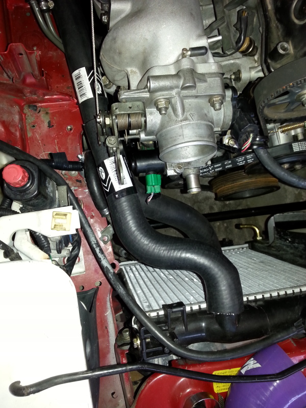 I wanted to add this information to the thread that mentions using the GM hose for the reroute but I didn't have permission to post in that thread. When using the GM hose (Gates part #22436) the hose is the right length and has the right bends to meet up with the radiator, but because it comes at the radiator at ~45 degree angle it can cause some clearance issues with your intercooler piping coupler right off the throttle body. I work at a parts store so I went and dug through hoses for a while until I found one that makes 2 tight 90 degree bends and and then meets up to the GM hose. Since you'll have to use a joiner in the straight section anyway, you can use a 1.25" pipe anywhere from 3 inches to 20 inches long. It might not give you enough clearance for a really fat radiator, but it does give a much needed extra inch or two. The hose is Gates part #21025, this thing fits a lot of cars like camry, corolla, pathfinder, etc. so it should be easy to find. Just thought this might be useful to some.