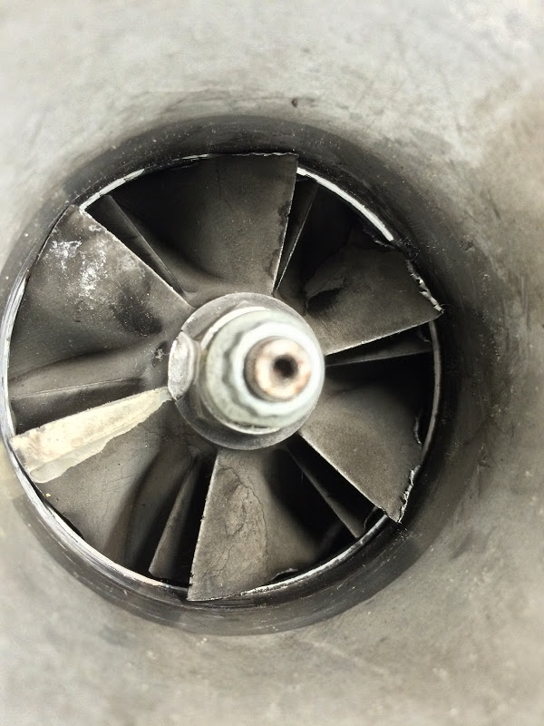 The pictures below show more detail. The rotating assembly doesn't do any rotating anymore - it is locked in position. The turbine wheel has contacted the housing and bent the fins.