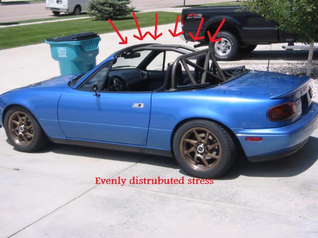 I don't completely agree with your stress analysis of it. Any force in the connecting bar will get brought back straight to either the windshield or the roll bar. It is still the same basic scenario. It might add a little strength, but if the car rolls, the windshield is still collapsing.