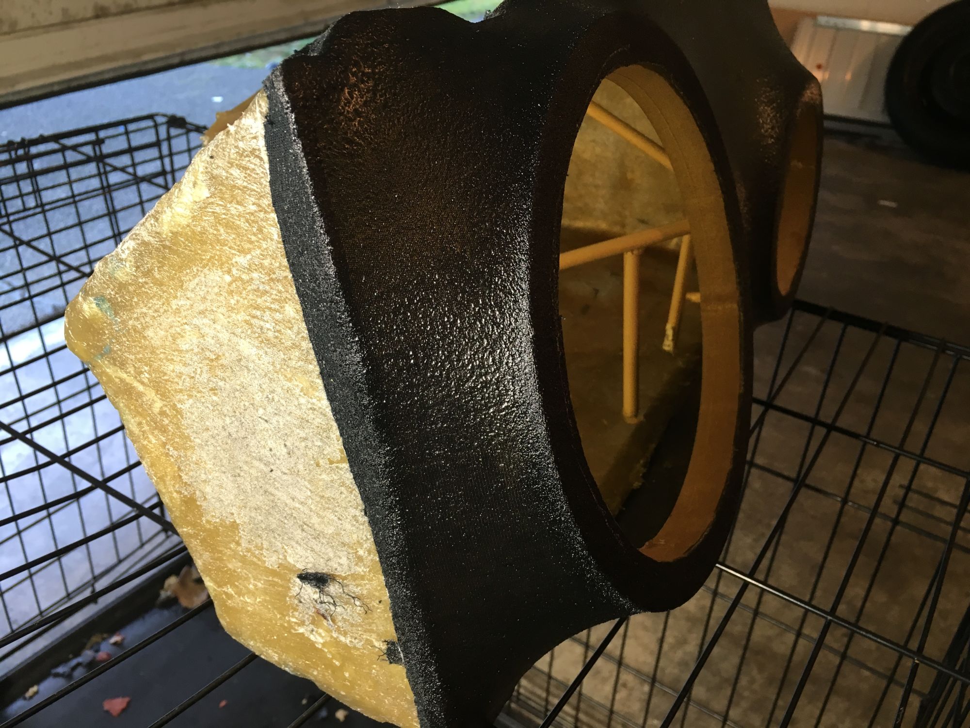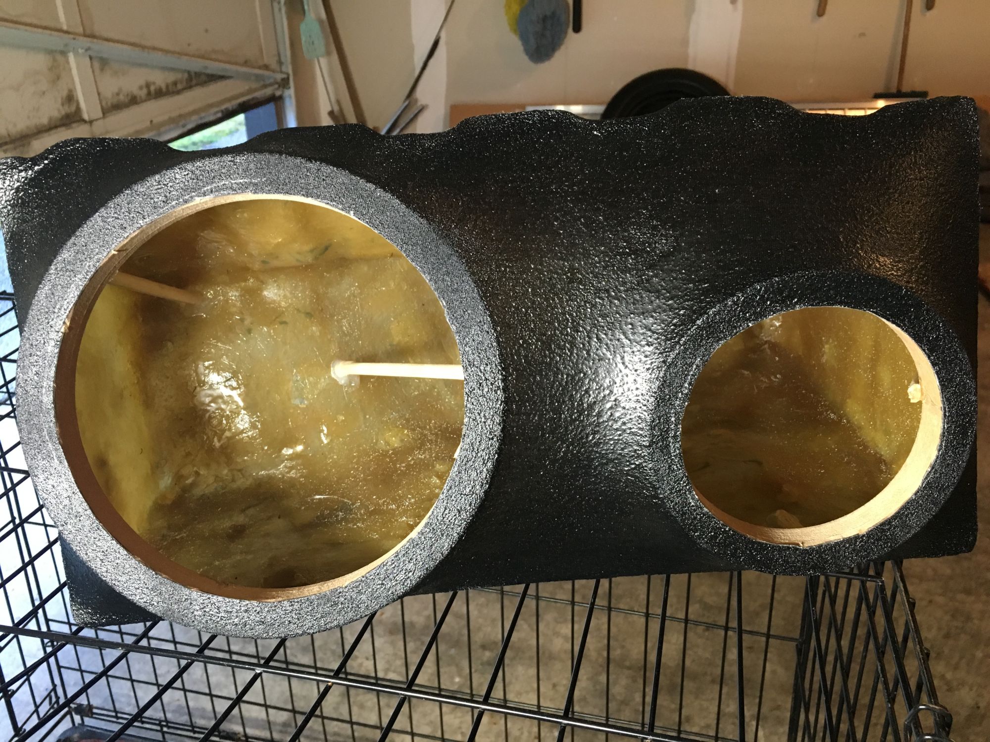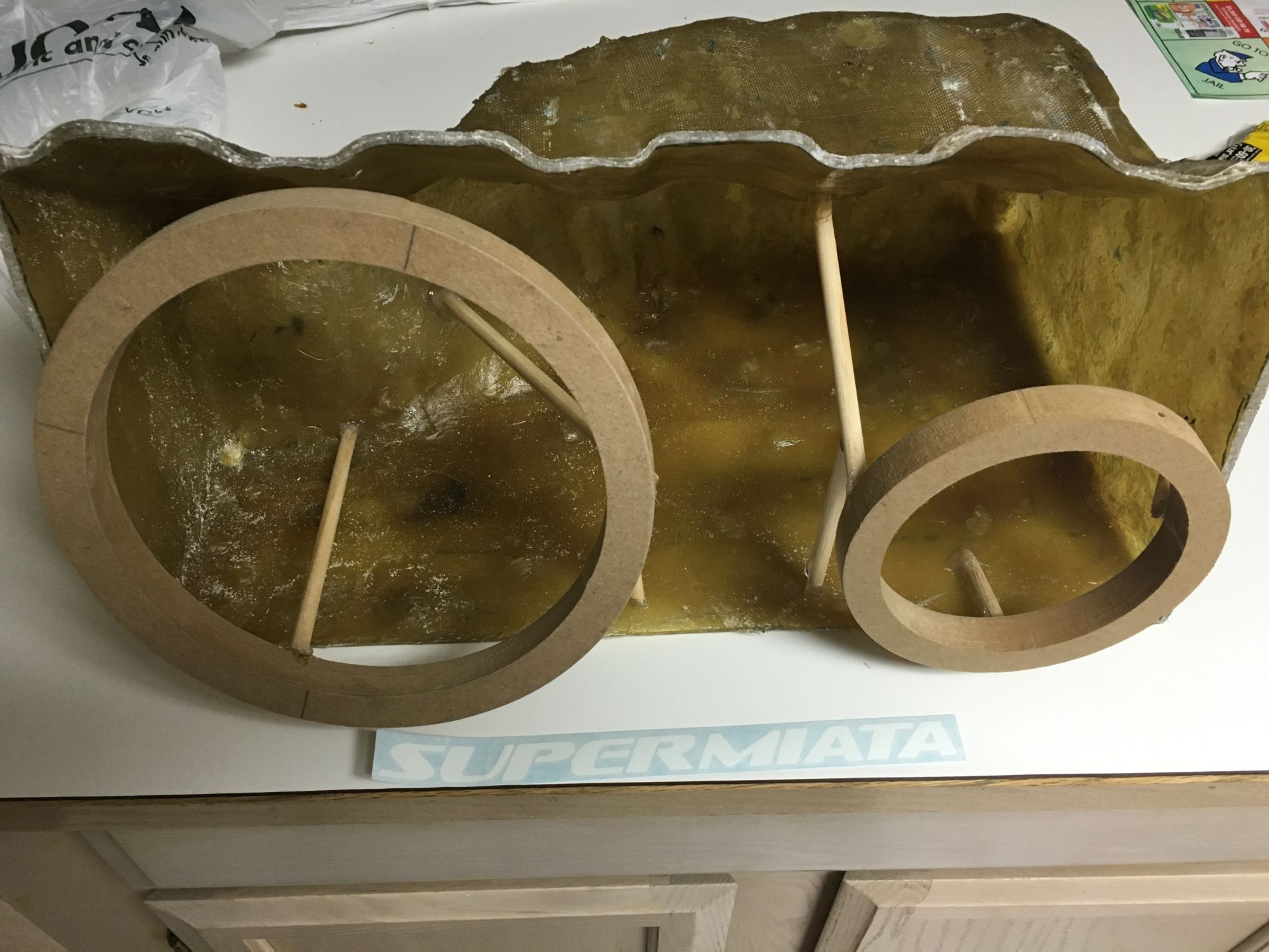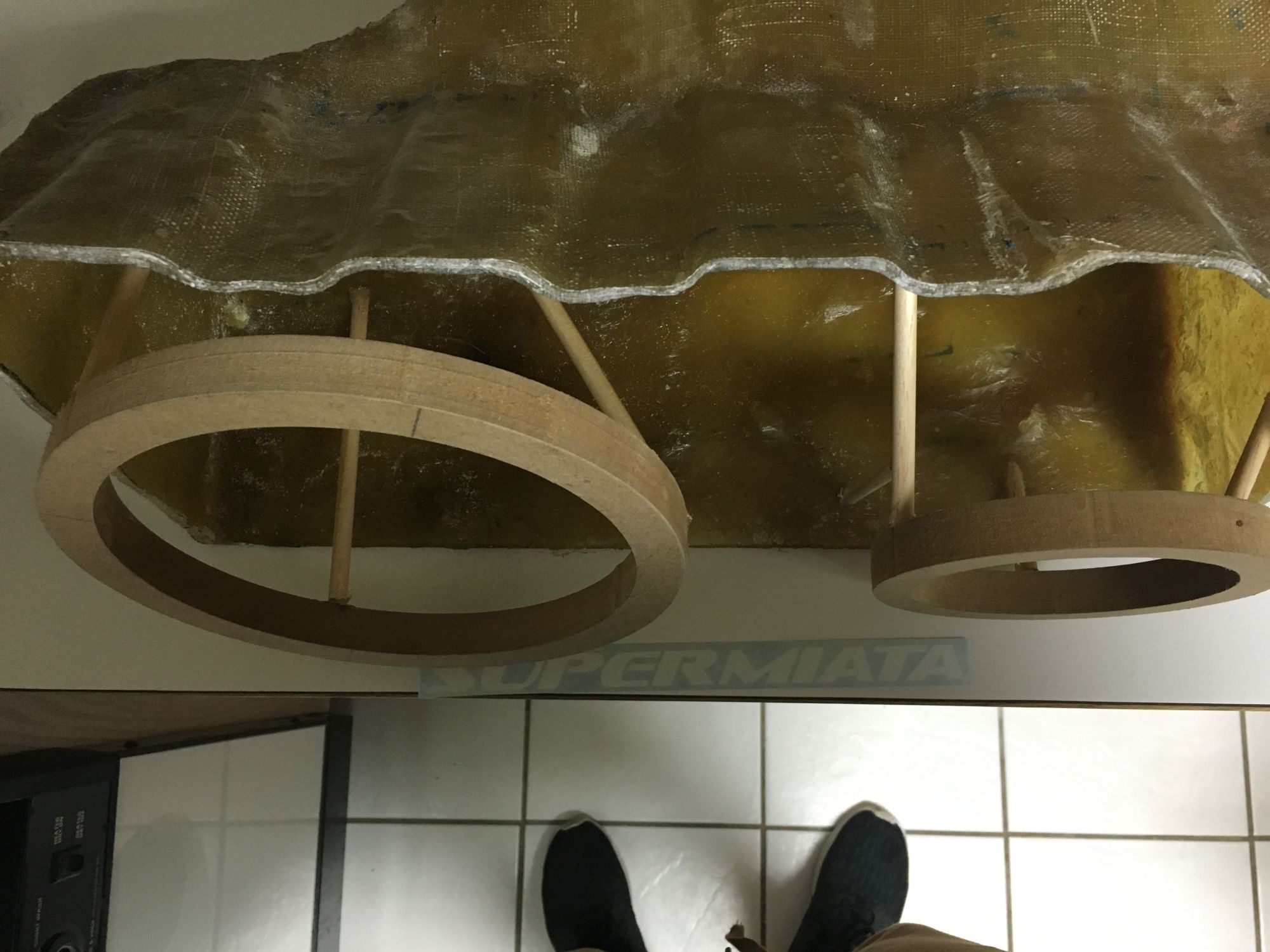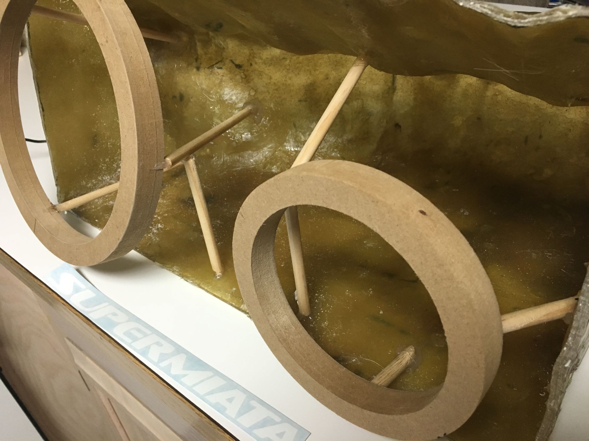 Some more progress was made today! I got the speaker rings from eBay since I don't have a router and didn't feel like using my little jigsaw to cut the rings out. Anyways here's some pictures of the rings mounted with small wooden dowels and hot glue: