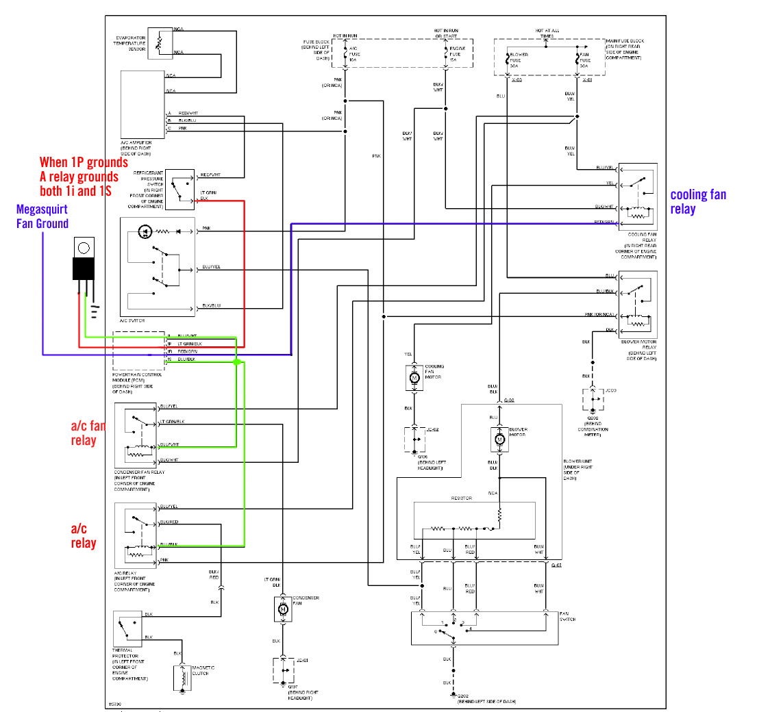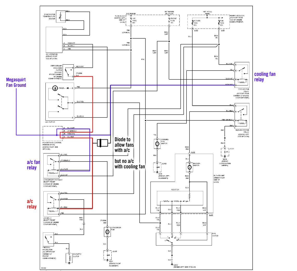 Nutshell: MS fan control activates both a/c and cooling fans. A/C switch output is jumped with a/c relay ground. A diode allows both fan relays to activate when the a/c relay is grounded as well.