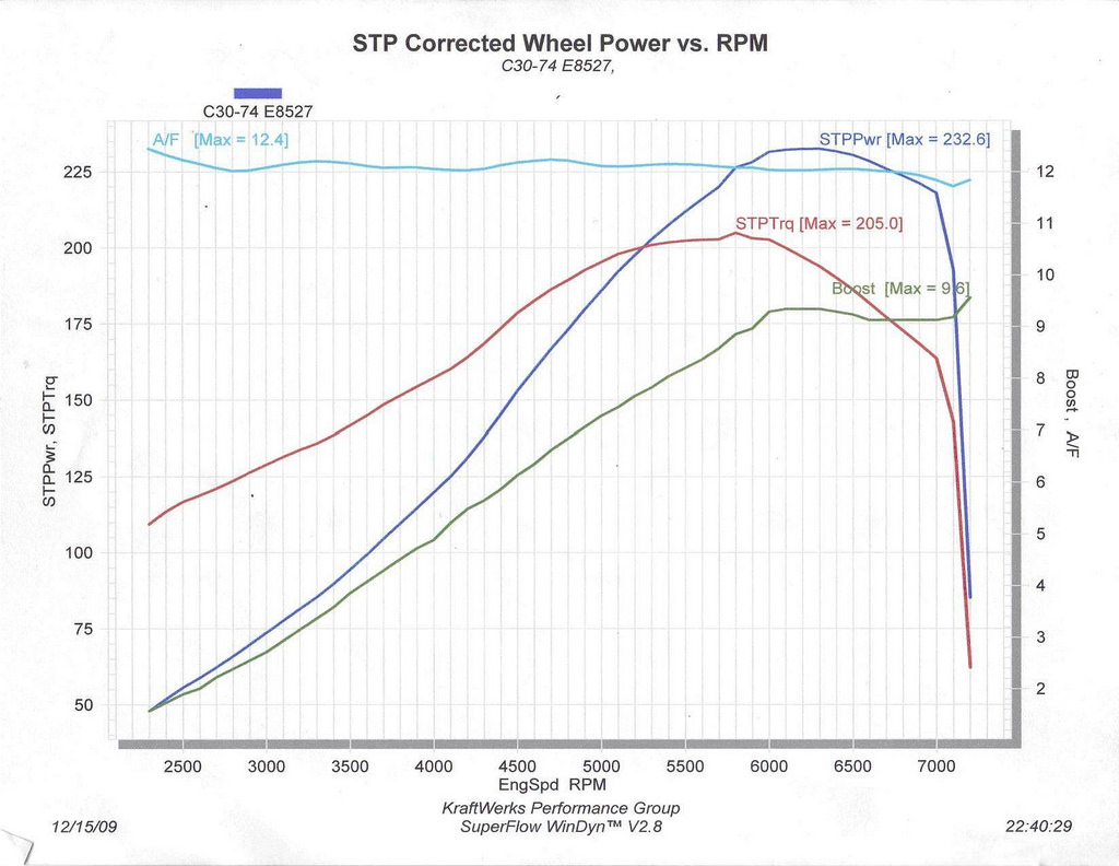 The old dyno numbers for bellwilliam's car were from a Superflow dyno, here is a sheet that was posted before on Miata.net. It's hard to say how this dyno comapres with the typical SoCal dynojet. Bellwilliam was also running what looks like a 12psi pulley configuration (with restrictor) due to the boost graph leveling off up top. This plot is also from when he was running E85, I believe this to be a key to making big power on the -74.