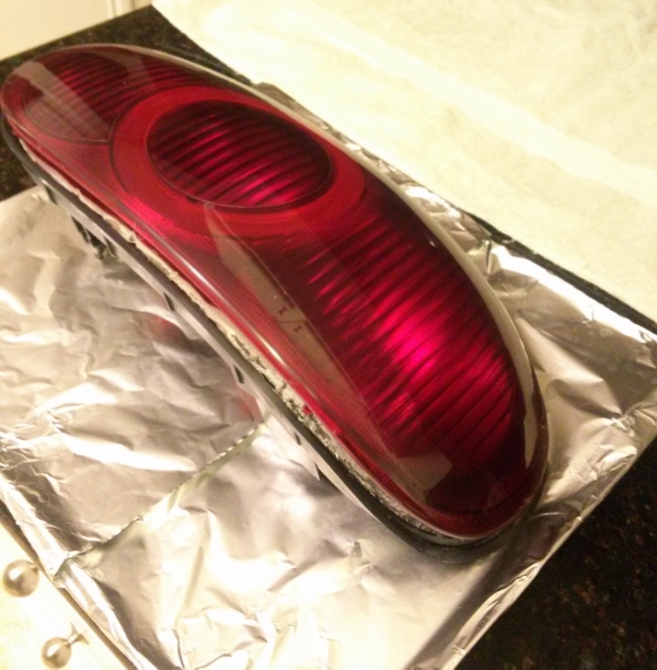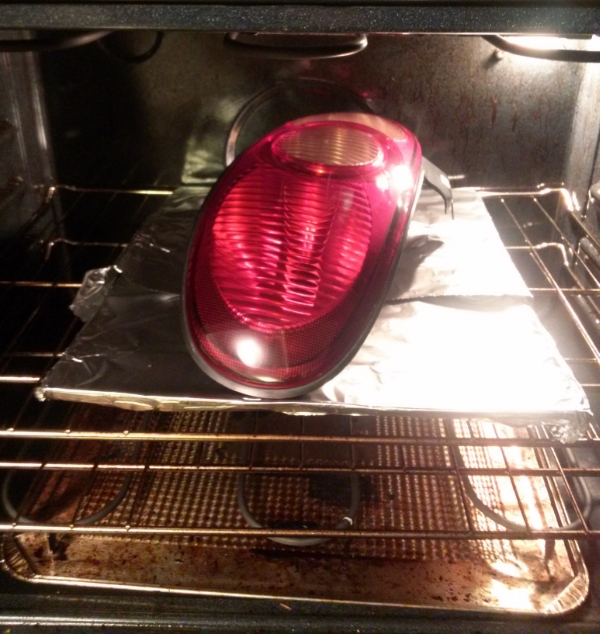 Preheat your oven to 200 degrees F and wrap a cookie sheet with tin foil. Bake each tail light for about 10-20mins depending on your oven.