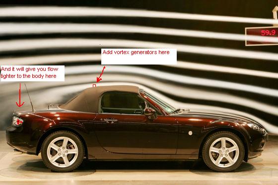 Is anyone aware of ANY pictures of a Miata in a wind tunnel with the smoke trails showing the air flow? (top up) I'm wondering if I can mount the wing I plan on using as more of an air deflector al la GT3 RS.