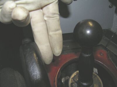 Well, I got the car back on the road today. I would say it took a good 12 hours total for everything (removal, replacement, flush/fill/drive/drain/refill the fluid) but at least 4 hours of that was turbo related. I ended up breaking a few welds on my Megan manifold and had to weld them up again. I think the way to do it, if you buy one of these things, is just to reweld everything to start with. Maybe pay someone to reinforce the thing. Anyway, I haven't cracked open the tranny yet but here is a picture of the shift **** on the old/new tranny. Both pictures were taken with the car in first gear. Hopefully this will silence the people who said it was operator error when I couldn't find 3rd gear (fingers in there for distance reference)<G>: