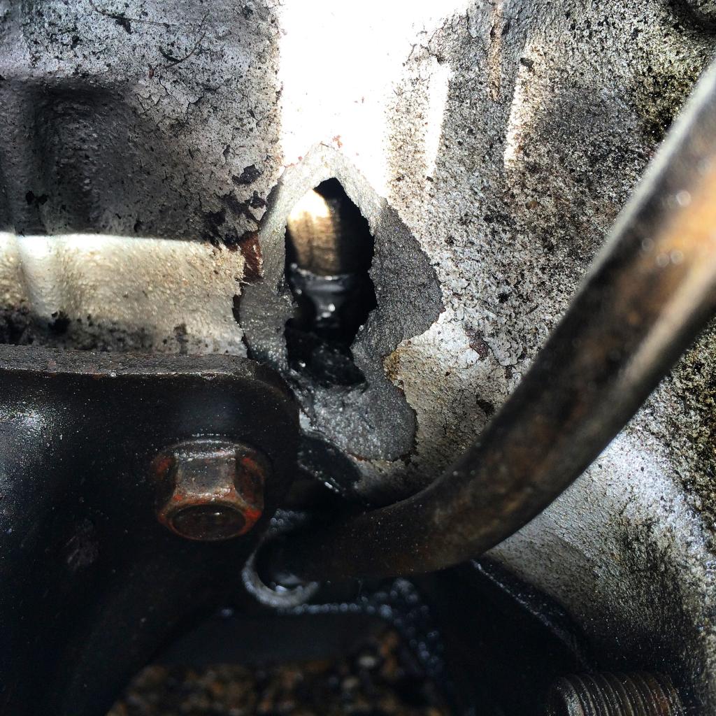 I'll post some pics of the hole in a moment but that's all I have. I haven't removed the engine yet so no pics of pistons or anything. I did removed the plugs today and they all look perfect so I don't think the piston has contacted the head. As soon as I've removed the engine I'll take the sump off and take some pics.