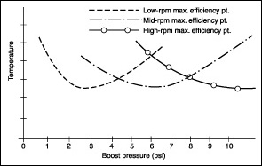 With a small turbo, the maximum efficiency point peaks early, and the temperatures will be lowest at low boost pressures. Once the pressure ratio increases and/or mass flow increases the temperatures quickly increase as the efficient drops below 60%. To keep temperatures down, thus ensuring high power outputs, a larger compressor is necessary.