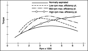Likewise, as the max efficiency point occurs at higher and higher rpm, cooler temperatures also occur. Cooler temperatures mean denser air, which keeps torque peaks at higher rpm. This is why a 2554 setup will always make more peak torque than me at low rpms, but I always tend to make more from 4K above with a greater peak HP.
