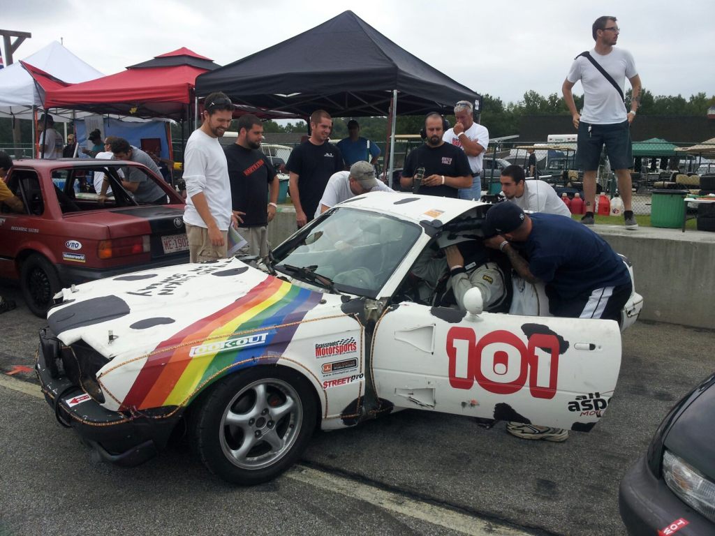 Started out kinda rough when after only an hour i the car our 1st driver pulled in and had thrown up in his helmet....remember no drinking the night before a race....ok just not so much drinking. Pulled him out and another got in. We got hit by a GIANT Chevy Impala but after a drive by we did not see any significant damage we told him to continue. Saftey break for 30 minutes and a track change from Grand to Full at 10pm. We changed to a fresh set of Star Specs (amazing tire, 3/4 tread on them after 12 hours of racing). Little rains storm but did not keep us from putting down some good times. Best lap at night was 2:35, not bad in the dark! Moved up to 5th place and was catching 4th when at the 6am the 20 hour mark the rear let go (dam them 1.6 rears!!!). Car was hurtin but still running well before the rear issue it was consuming a quart of 20-50 an hour. So I bet some rings are in our future.