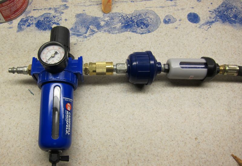 Filter / regulator, then disposable moisture separator, then desiccant. I don't think moisture in the line is a problem, I think I just suck at this.