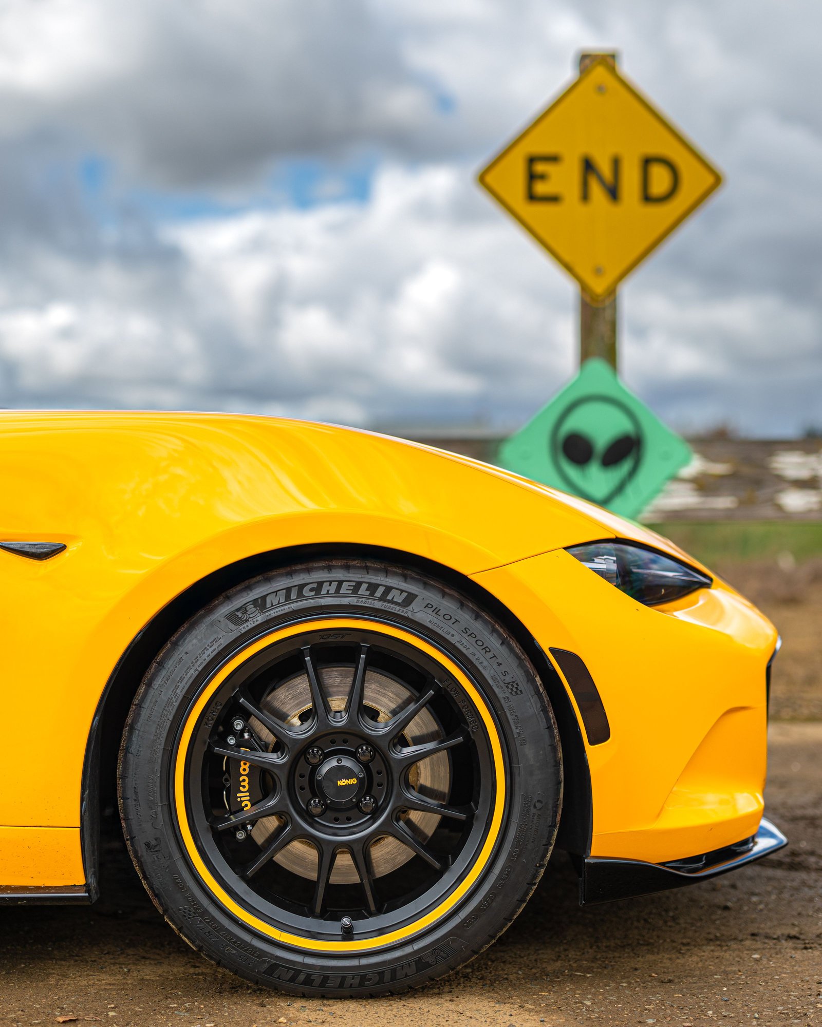 Konig Hypergram 17x8 4X100 +45 Matte Black - with yellow wheel stripe added to match the car and the custom paint on the Wilwood calipers. Nice!