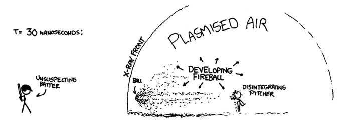 These gamma rays and debris expand outward in a bubble centered on the pitcher’s mound. They start to tear apart the molecules in the air, ripping the electrons from the nuclei and turning the air in the stadium into an expanding bubble of incandescent plasma. The wall of this bubble approaches the batter at about the speed of light—only slightly ahead of the ball itself.