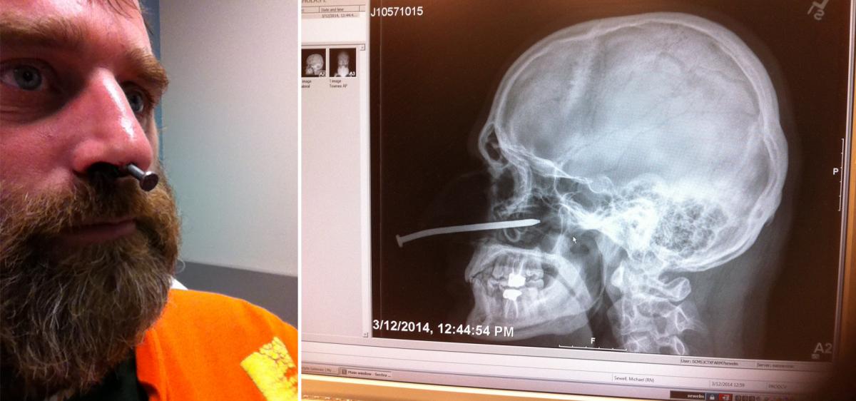 Apparently he hit the nail "wrong" and ended up like this. The only logical "wrong" way to hit it and end up like this is to stand it up on the head and then smash your own onto it.