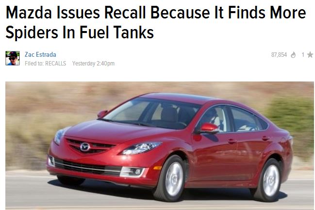Hey, that's no joke. I actually had a fuel tank in a 1995 BMW 750 implode and leak gas all over my driveway due to a charcoal canister vent line that was clogged by spider webs. BMW even knew about the issue; had a TSB out for it and all, but refused to issue a actual recall. Their great flagship V-12 model, crippled by a ******* spider! Just one of many of my pet peeves about BMW.