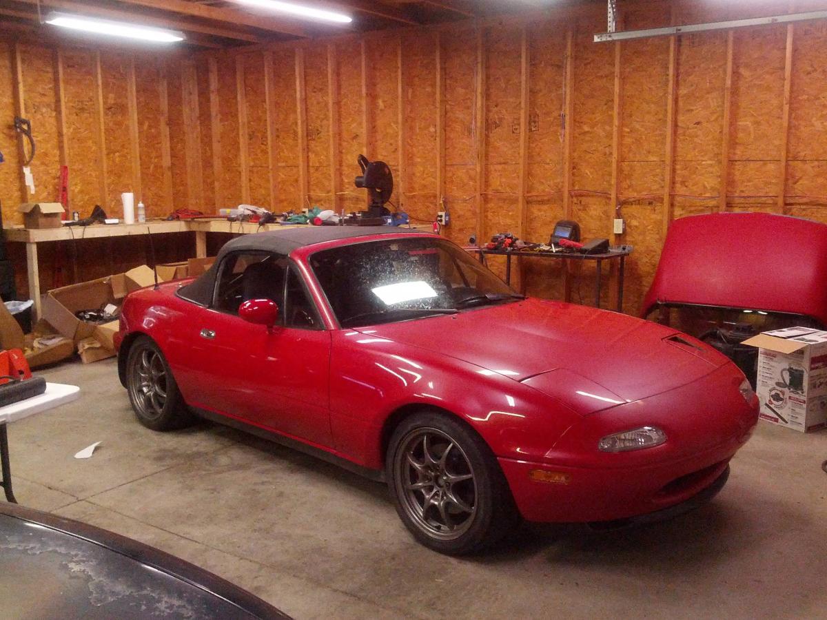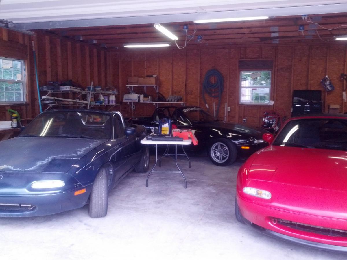 I can fit 3 miata's in my garage and still have room to work on them all at the same time. The black car in the background is my 94 which is getting the swaybar and brakes off the red one. The green one to the left is my 97 which is getting the clutch and top from the red one, along with a few other small things. After I am done taking all the parts off the red one that I want I will put it all back together in stock form and hopefully sell it to my little cousin to be her first car.
