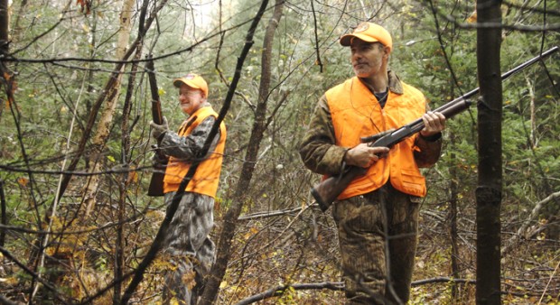 Two hunters are out walking in the woods when they come across a hole in a ground.