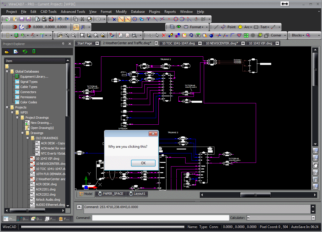 Today, I discovered that if you click the word "WireCAD" down in the lower-left corner of the WireCAD application, a message window pops up asking "Why are you clicking this?"