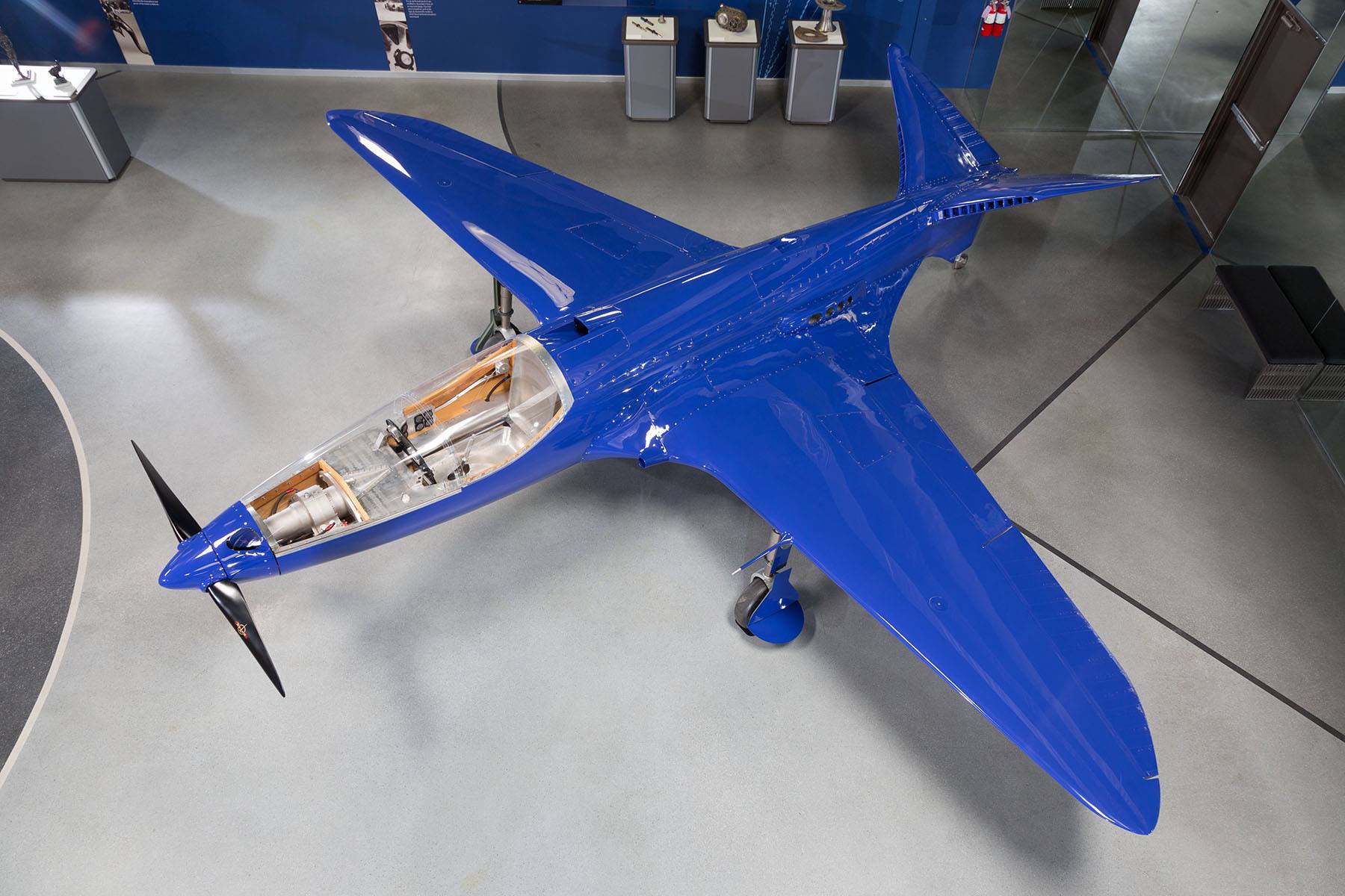 "The Model 100 had an unusual inboard mounted twin engine arrangement driving forward mounted twin counter rotating propellers through driveshafts."