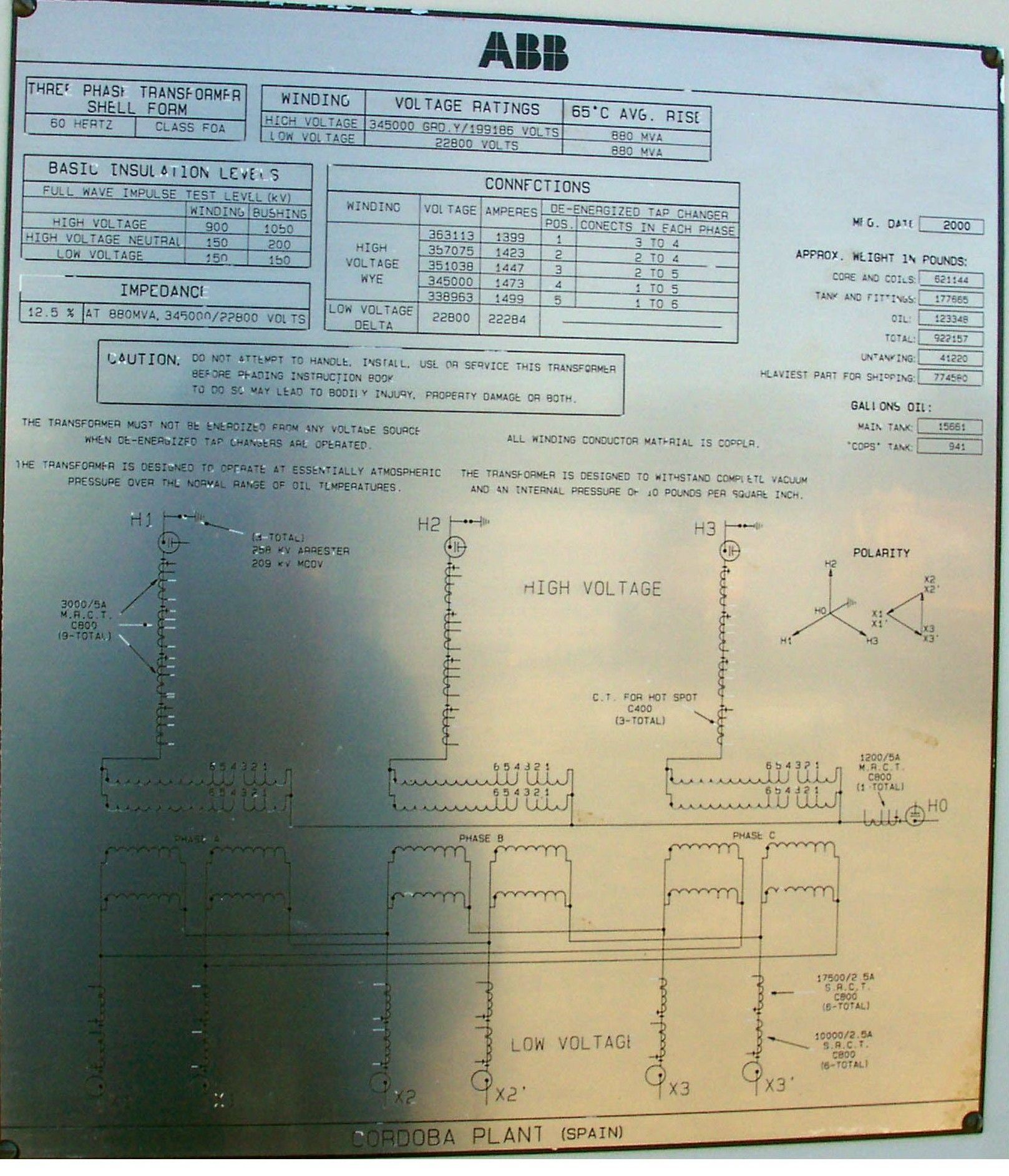 <p>Joe, look at the 345,000 V tap on the primary. 880MVA power delivery. Current, by definition on 3-phase is 880,000,000 / 345,000 / sqrt3. This gives the 1472.7, rounded up to 1473. It's the math that yields the funny numbers.</p><p>I can't answer the question about why not rounding, exept someone will do the math and say.. "wait a minute, you said this was a 880MVA unit."</p><p>Typically, the paper only creates a physical space and a minimum of structure. The oil does the dielectric work. The oil is tested and changed or filtered as needed (on a de-energized unit in my experience). Though, it is true that the degredation of the paper makes it weaker such that impulses can cause conductors to move, lowering the dielectric. That is why most poletop distribution XFMR's fail during inclement weather condtions (thunderstorms).</p><p>Higher currents mean higher temperatures, which does shorten life. It's all analog.</p><p>For general presentation:</p><p>http://www.feca.com/HDS_BASIC.pdf</p><p> </p>