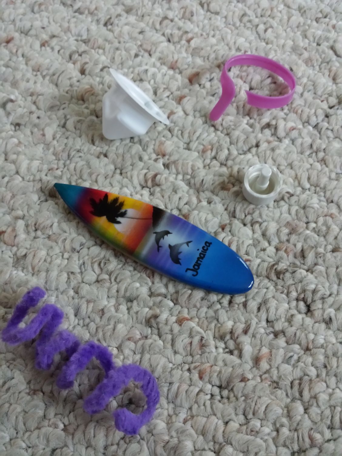 With all the cat toys we have, these "toys" are their favorite. Pipe cleaner, surfboard wtf, press and seal end thingy, nail polish cap and finally a milk tie.